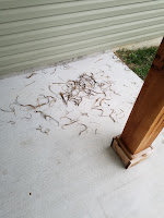 In other news it is Man vs Bird at the Meadow. Birds have been an issue since we moved in. They have wanted to nest on our outdoor light fixtures so we placed a deterrent and that has worked well. We also got a rubber snake. Now they are trying to nest on our back patio in the guttering. They also attempted to nest in the new garage guttering. Handy dandy products to block them have been working on the new garage. As for the porch we moved the rubber snack from the front porch to the back and we have even purchased an owl. Neither seem to be working all that well. What has been working is our persistent knocking down the nest in progress. So every morning it has become my ritual to go outside, usually in pajamas, no less, to knock down the beginnings of a nest. Lately the maker has been a bit outraged and lets us know. It's been funny, but not. I feel bad, but I DO NOT want a nest. They poop all over as they fly in and out so NO NEST wanted! After my initial knock down MiRV takes over. We keep tabs all morning; going out to ward off more nest making attempts and knock down what might have snuck through. It's a tough battle!